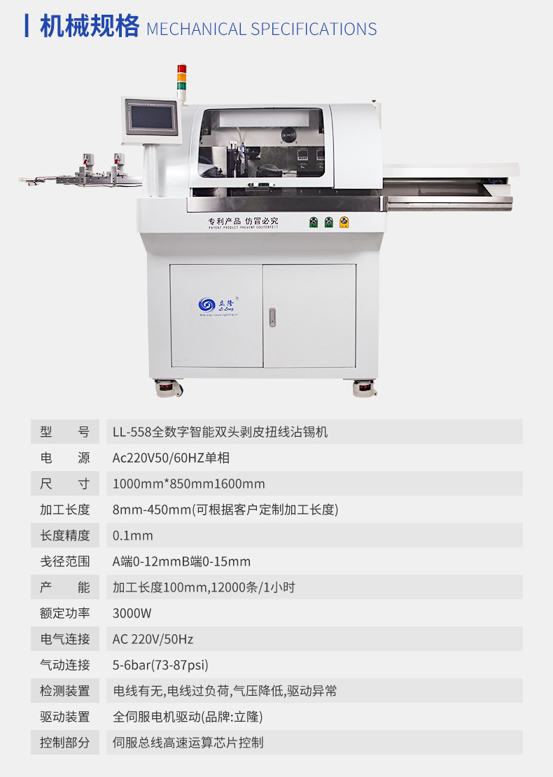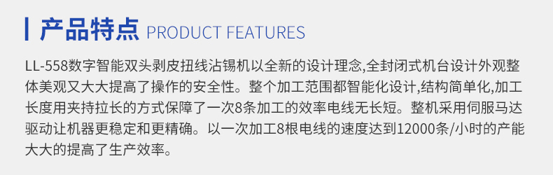 LL-558全數(shù)字智能雙頭剝皮扭線(xiàn)沾錫機(jī) 產(chǎn)品說(shuō)明: LL-558數(shù)字智能雙頭剝皮扭線(xiàn)沾錫機(jī)以全新的設(shè)計(jì)理念,全封閉式機(jī)臺(tái)設(shè)計(jì)外觀(guān)整體美觀(guān)又大大提高了操作的安全性。整個(gè)加工范圍都智能化設(shè)計(jì),結(jié)構(gòu)簡(jiǎn)單化,加工長(zhǎng)度用夾持拉長(zhǎng)的方式...